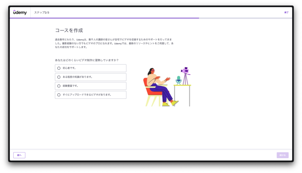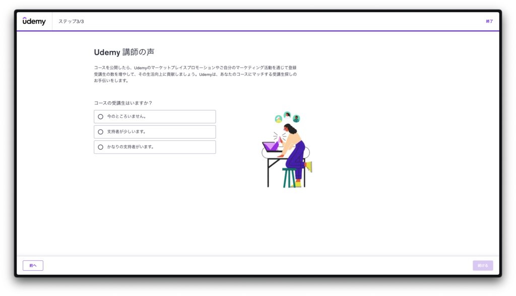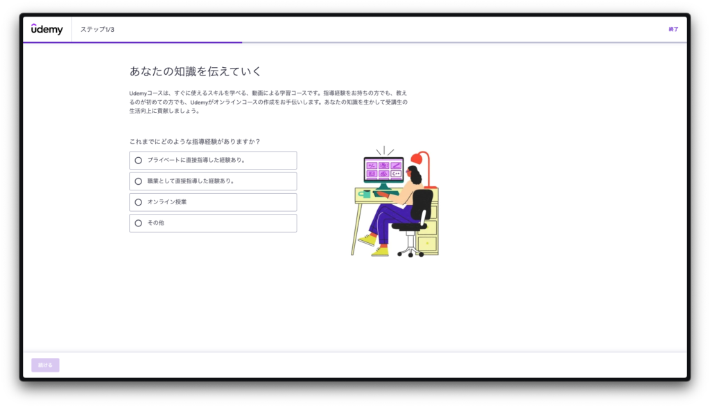 「経験なし」と回答しても講師登録は完了します。Udemyは未経験の講師でも歓迎してくれるプラットフォームです。