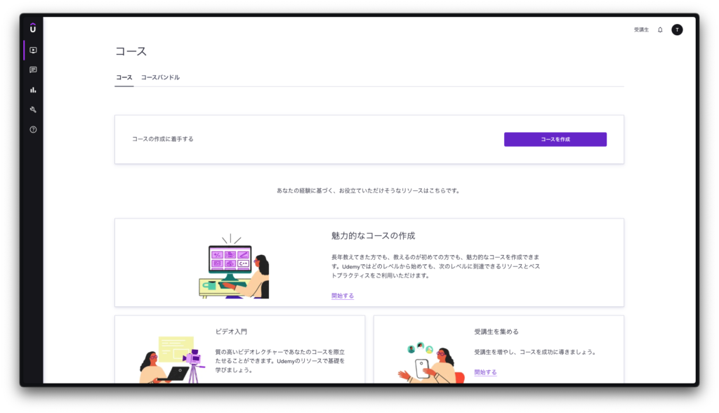 「切り替えたら戻れないのでは?」と不安に思う方もいるかもしれませんが、右上の「受講生」をクリックすればいつでも切り替えできます。気軽に切り替えてしまって大丈夫です。コースを1本も作らなくてもペナルティはありません。