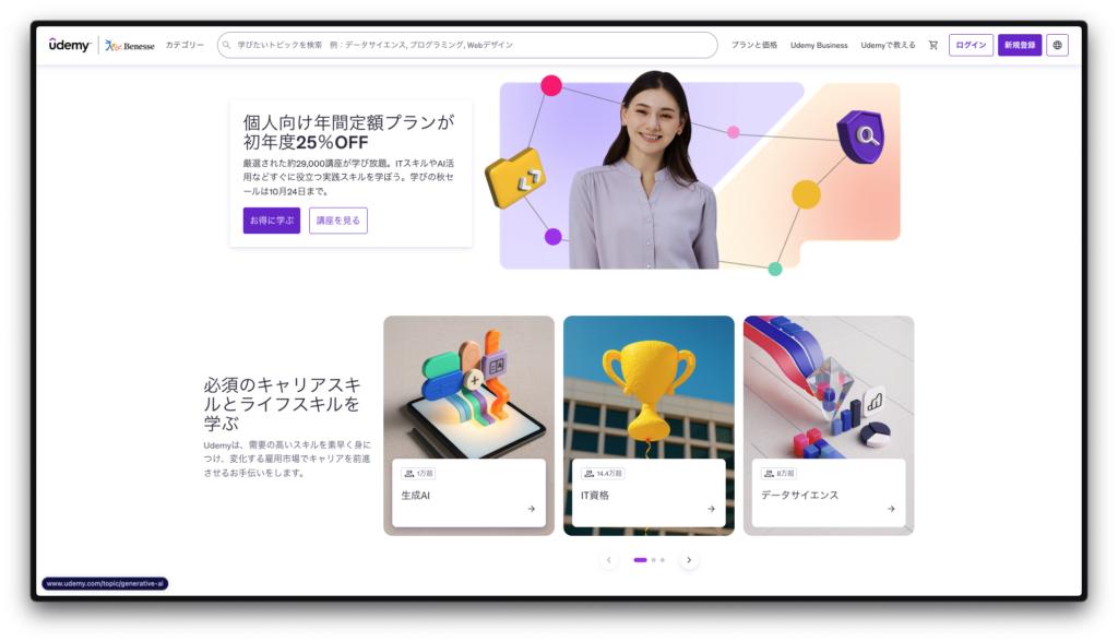 Udemyのトップページにアクセスし、右上の「新規登録」をクリックします。
